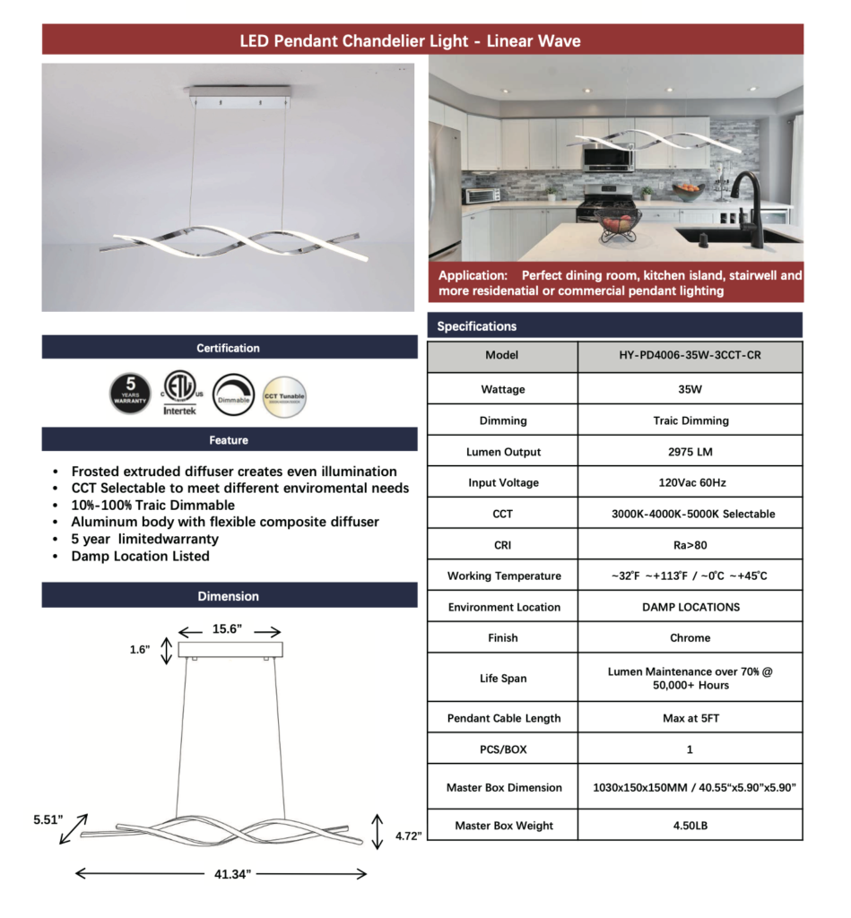 LED Pendant Chandelier Light – Linear Wave – Full Feature List