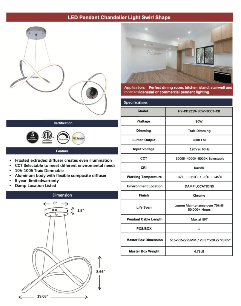 LED Pendant Chandelier Light – Swirl Shape – Full Feature List