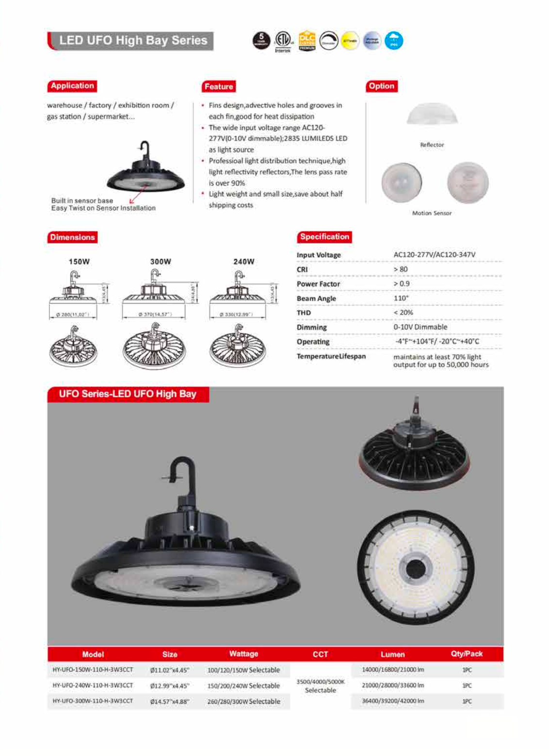 The LED UFO High Bay Series is engineered for high-ceiling industrial spaces like warehouses, factories, supermarkets, and exhibition halls. Featuring advanced heat-dissipating fin designs, wide input voltage range (AC120–347V), and ultra-bright 2835 SMD LEDs, this series delivers up to 54,000 lumens. It includes options for motion sensors and reflectors, supports 0-10V dimming, and operates in a wide temperature range. Built for easy installation and maximum light efficiency, it’s ideal for large, open environments requiring consistent performance and long lifespan.