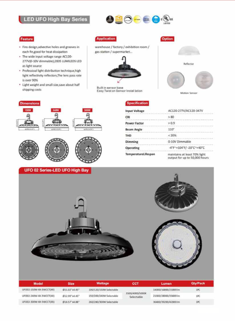 The LED UFO High Bay Series is engineered for high-ceiling industrial spaces like warehouses, factories, supermarkets, and exhibition halls. Featuring advanced heat-dissipating fin designs, wide input voltage range (AC120–347V), and ultra-bright 2835 SMD LEDs, this series delivers up to 54,000 lumens. It includes options for motion sensors and reflectors, supports 0-10V dimming, and operates in a wide temperature range. Built for easy installation and maximum light efficiency, it’s ideal for large, open environments requiring consistent performance and long lifespan.