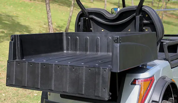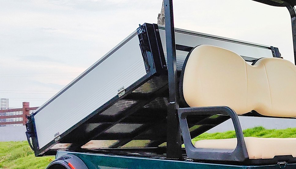 Heavy duty thermoplastic utility box converts a golf cart to an OEM style utility vehicle. Rugged textured cargo bed with enormous usable dimensions. Features fixed bed with flush folding tailgate for easy loading and unloading. Great for agricultural and industrial applications as well as everyday hauling.