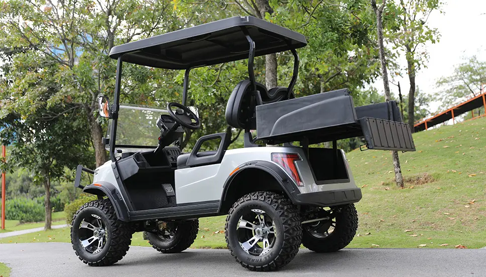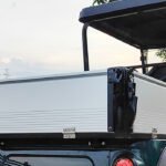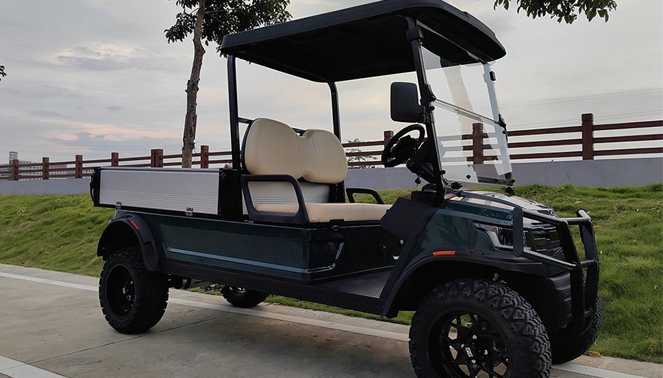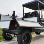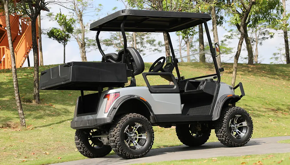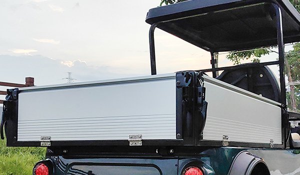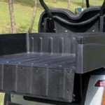 Heavy duty thermoplastic utility box converts a golf cart to an OEM style utility vehicle. Rugged textured cargo bed with enormous usable dimensions. Features fixed bed with flush folding tailgate for easy loading and unloading. Great for agricultural and industrial applications as well as everyday hauling.