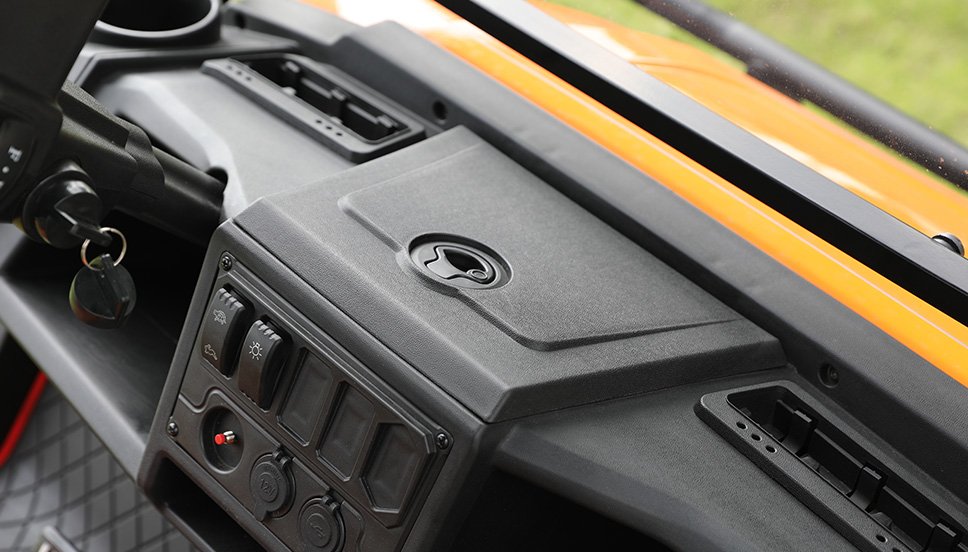 Functional dash with versatile cup and technology holders and multiple storage areas. Can easily fulfill your demands for storing or carrying any items that may be handy while driving this utility vehicle.