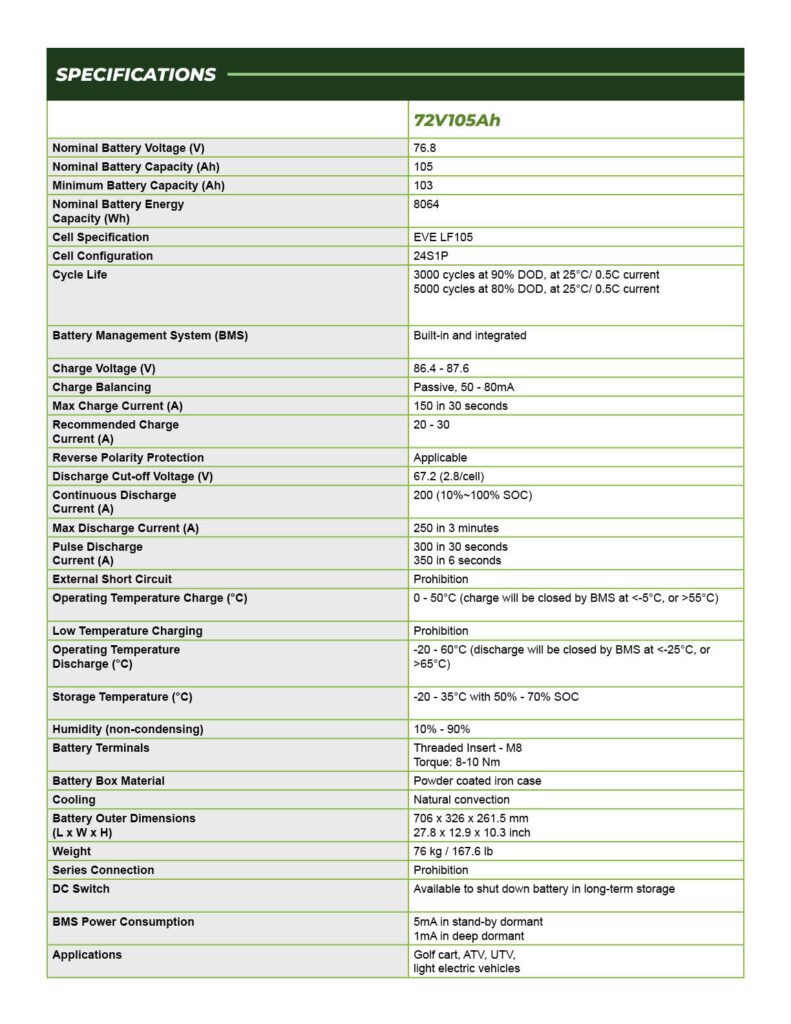 Lithium Batteries Zippy 72V105Ah Lithium Battery LIFEPO4 72V Was Now CA$2,495 Sale Nominal Battery Voltage (V): 76.8Nominal Battery Capacity (Ah): 105Minimum Battery Capacity (Ah): 103Nominal Battery Energy Capacity (Wh): 8064Cell Specification: EVE LF105Cell Configuration: 24S1PCycle Life: 3000 cycles at 90% DOD, at 25°C / 0.5C current5000 cycles at 80% DOD, at 25°C / 0.5C currentBattery Management System (BMS): Built-in and integratedCharge Voltage (V): 86.4 – 87.6Charge Balancing: Passive, 50 – 80mAMax Charge Current (A): 150 in 30 secondsRecommended Charge Current (A): 20 – 30Reverse Polarity Protection: ApplicableDischarge Cut-off Voltage (V): 67.2 (2.8/cell)Continuous Discharge Current (A): 200 (10%~100% SOC)Max Discharge Current (A): 250 in 3 minutesPulse Discharge Current (A): 300 in 30 seconds / 350 in 6 secondsExternal Short Circuit: ProhibitionOperating Temperature Charge (°C): 0 – 50°C (charge will be closed by BMS at <-5°C, or >55°C)Low Temperature Charging: ProhibitionOperating Temperature Discharge (°C): -20 – 60°C (discharge will be closed by BMS at <-25°C, or >65°C)Storage Temperature (°C): -20 – 35°C with 50% – 70% SOCHumidity (non-condensing): 10% – 90%Battery Terminals: Threaded Insert – M8Terminal Torque: 8-10 NmBattery Box Material: Powder coated iron caseCooling: Natural convectionBattery Outer Dimensions (L x W x H): 706 x 326 x 261.5 mm / 27.8 x 12.9 x 10.3 inchWeight: 76 kg / 167.6 lbSeries Connection: ProhibitionDC Switch: Available to shut down battery in long-term storageBMS Power Consumption: 5mA in stand-by dormant / 1mA in deep dormantApplications: Golf cart, ATV, UTV, light electric vehicles Quantity Enter an amount $ Add To Cart Buy Now View Catalogue Zippy Global Trading Lithium Batteries specifications comparison Sale Lithium Batteries Zippy 36V105Ah Lithium Battery LIFEPO4 36V CA$1,695 Sale Lithium Batteries Zippy 48V105Ah Lithium Battery LIFEPO4 48V CA$1,895